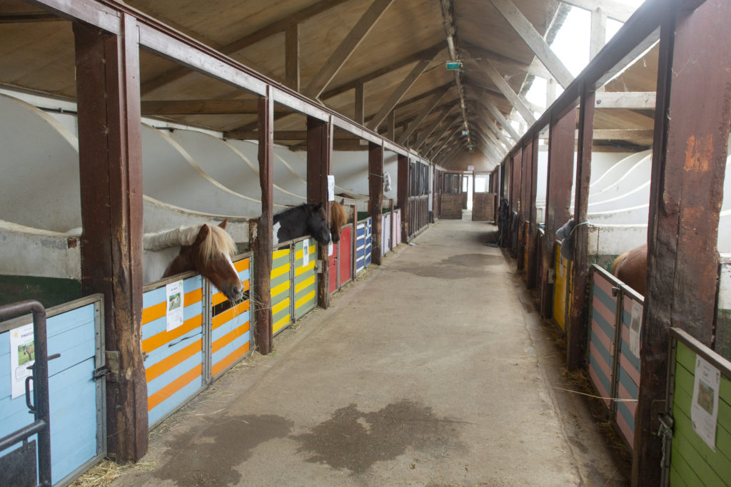 Allée dédiée aux poneys shetland avec des petits boxes adaptés aux enfants et une sellerie